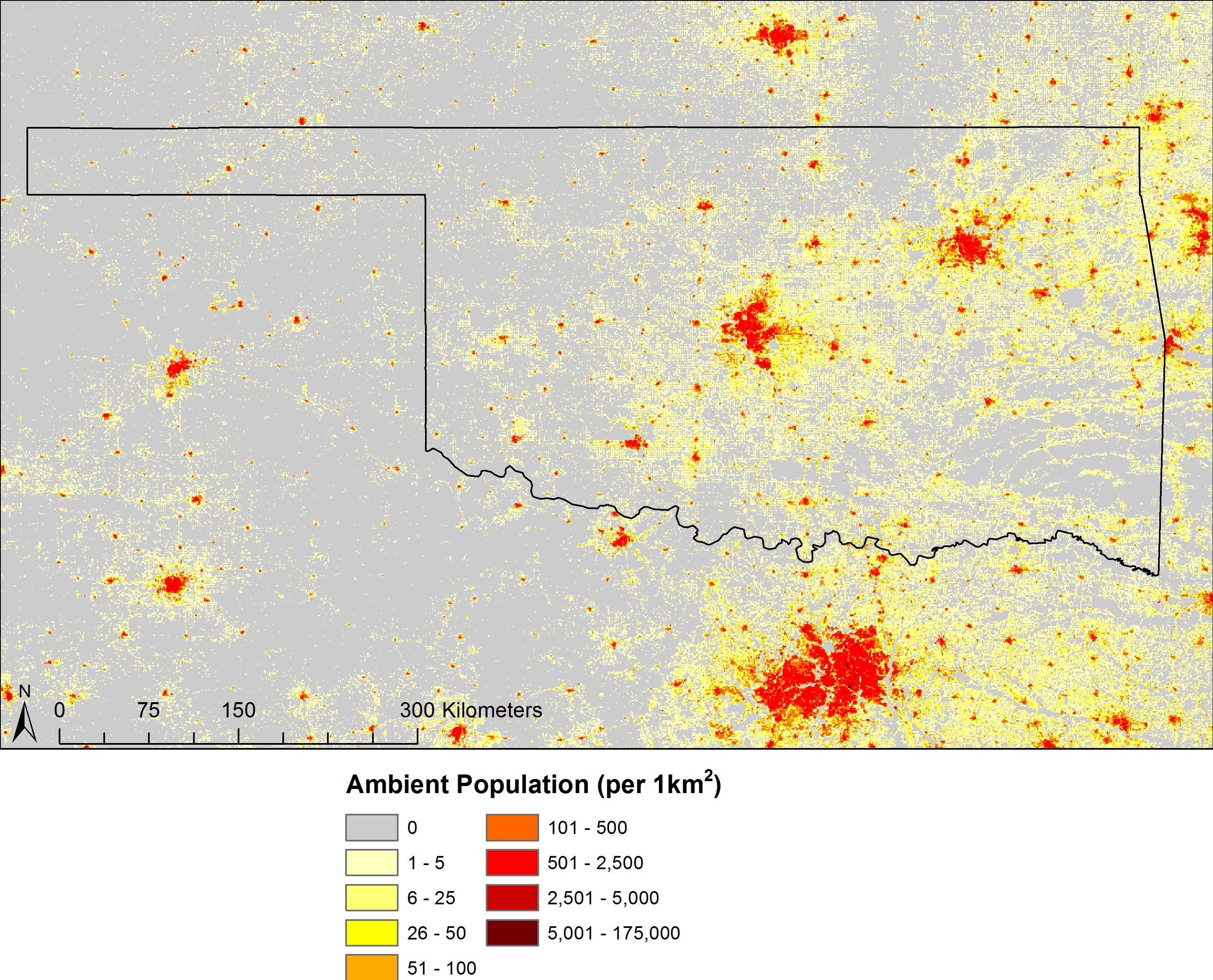 Figure 6: Ambient population from the LandScan data for Oklahoma, 2012. Spatial resolution: 1km.