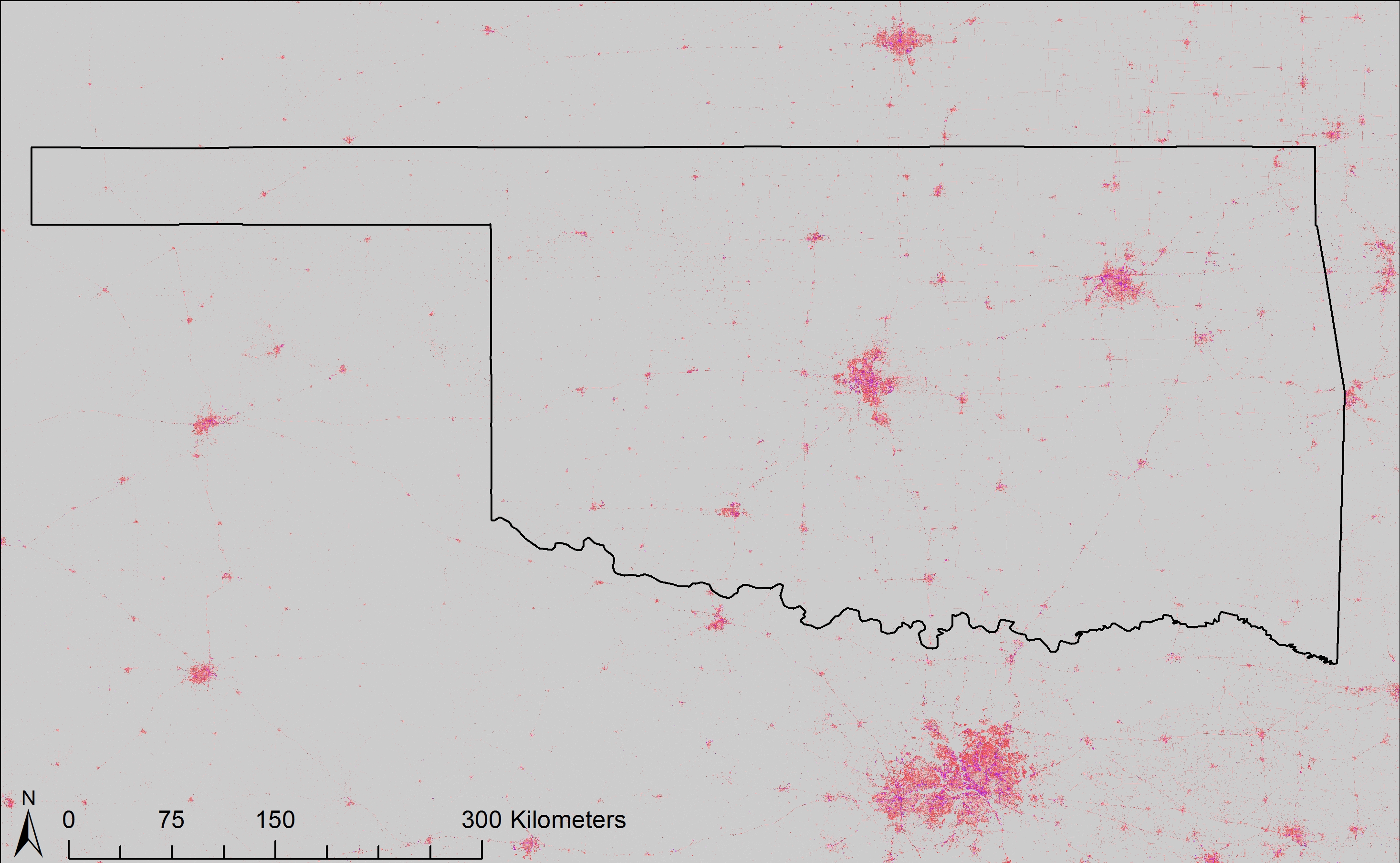 The second map provides the impervious surface layer from the National Land Cover Dataset for Oklahoma (Homer et al. 2015). The spatial resolution of this data is 30m and every pixel is color coded according to the percentage of impervious surface. While human influence appears incredibly large and almost overpowering in the anthromes maps and even the Landscan data, the 30m resolution makes this influence look almost puny.
