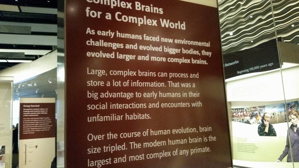 brain graphNext, one encounters an array of enormous graphs that track our planet’s fluctuating climate from 10 million years ago to the present. Key points in human evolution—as when our ancestors began to walk upright, make tools, or hunt—are marked by vertical lines linking these advances with climate shifts.  One such line connects an episode of “rapid increase in brain size” at approximately 500,000 years ago to what appears to be a pronounced period of climate instability. 200,000 years ago, another display informs us, modern humans evolved in an African climate that “fluctuated dramatically.” Still another observes that “large, complex brains can process and store a lot of information” which proved a “big advantage” to our ancestors. “The modern human brain,” it boasts, “is the largest and most complex of any primate.”