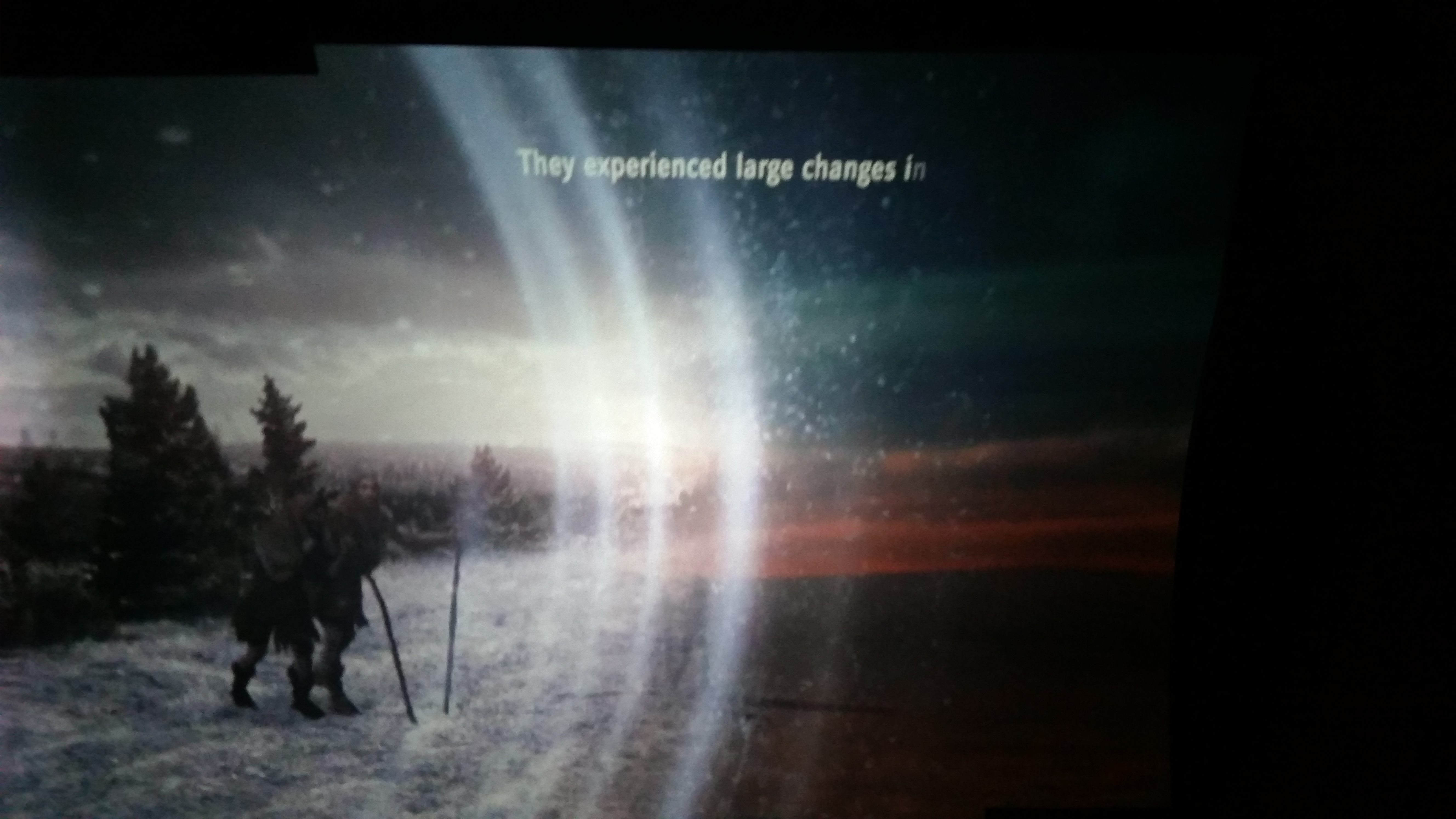 Upon entering the Hall, visitors are enveloped in a tunnel-like construction whose curved walls flash with colorful, filmic depictions of early humans doing early-human-like things. Their existence was defined by constant exposure to harsh and fluctuating climates, the exhibit explains.they experienced large changes