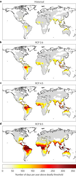 The number of days each year that exceed limits in which heat can be deadly for humans. a) The average number of lethal heat days between 1995 and 2005. b) – d) Projected average days in 2100 under differing climate change scenarios. b) Scenario RCP 2.6 represents rapid and immediate decline in greenhouse gas emissions, c) Scenario RCP 4.5 represents a later decline in greenhouse gas emissions and d) Scenario RCP 8.5 represents a “business as usual” model where emissions are not reduced. Figure from Mora et al. 2017 Nat. Clim. Change.