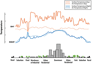 The heat island effect in cities changes as a function of the type of surface. Figure courtesy of the EPA.