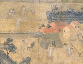 But Lorenzetti also indicates the social relations that underlie these physical manifestations of niche construction. The harvest scene near the center of the landscape, just above the road, shows reapers whose individual actions are coordinated to produce sheaves of wheat, and also threshers, whose movements must be synchronized to effectively remove the grain. Thus in his depiction of the extraction of resources, from an environment modified to accommodate that activity, Lorenzetti shows that these core activities of niche construction operate in a social manner.