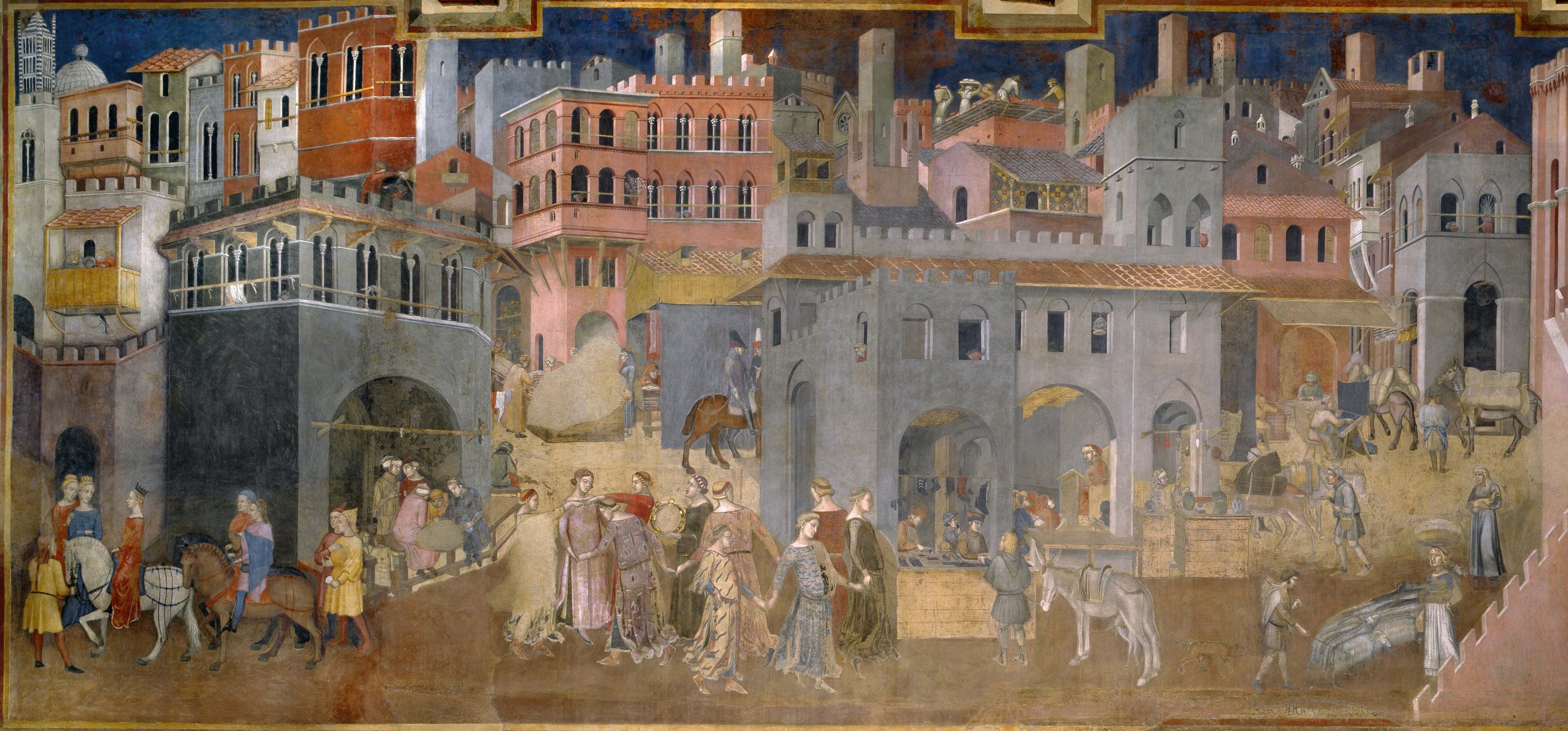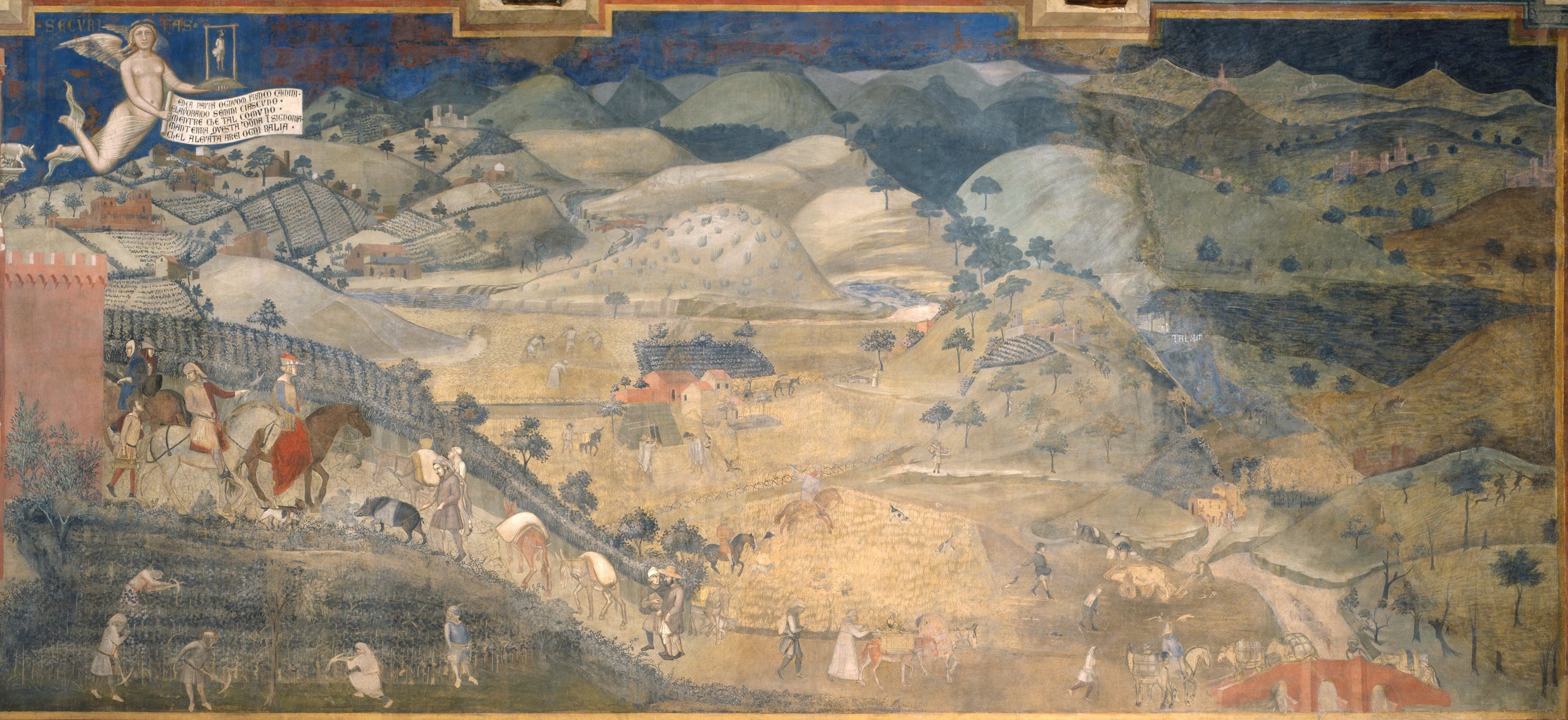 But the statement I’ll discuss is a pictorial one. It is the 14thcentury Sienese painter Ambrogio Lorenzetti’s fresco series known as the “Allegory of Good and Bad Government.” Painted in 1338-39, the series consists of panels on three walls of Siena’s city council chamber. The center panel (on the left in the image above), which faces the side of the room where the nine city magistrates would have sat to deliberate, is manifestly an allegory of the virtues those in power (the immediate audience of the painting) should internalize. As intellectual historian Quentin Skinner has shown, in this section of the series Lorenzetti depicts a normative conception of politics, derived from the tradition of civic republicanism, according to which the leaders of the state should dedicate themselves to the common good. The other two walls depict, on the left (not visible above), the effects on the republic when that norm is violated, and on the right, the effects when it is upheld. In both cases, Lorenzetti shows in idealized form the poorly and the well governed city, and the surrounding country-side of each.