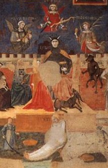 I will close by elaborating the civic republican quality of Lorenzetti’s view. Niche destruction, he shows, is the consequence of unjust attitudes among the citizens. Tyranny triumphs over Justice, Fear’s banner declares, “because each seeks only his own good.” In line with traditional civic republican theory, Lorenzetti frames this idea in terms of dedication to the Common Good. Where Justice rules, according to text on the center wall (showing the Allegory of Good Government), the citizens “make the Common Good their Lord”—but “where Justice is bound, no one is ever in accord for the Common Good.”